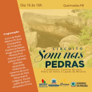 A cidade de Queimadas será a próxima parada do projeto Som nas Pedras, neste sábado (16). Após passar por Juru, Matureia, Teixeira, Princesa Isabel, Congo, Monteiro e Serra Grande, a arte, a cultura, o artesanato e a gastronomia de Queimadas será apresentada aos turistas e paraibanos, desta vez, em três ambientes: Caverna da Loca, Pedra do Vento e Lajedo Mirante.