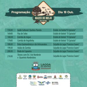 A cidade de Lagoa de Dentro recebe neste final de semana a Rota Cultural Raízes do Brejo. As atividades culturais têm início na sexta-feira (18), às 6h da manhã, com hasteamento das bandeiras nacional, do Estado e da cidade nas dependências da sede da prefeitura. Está prevista uma apresentação do coral Raio de Luz. Os eventos prosseguem pela manhã com a realização de uma Oficina de Teatro, às 9h30. À tarde, a programação tem início com uma Oficina de Flauta Doce. A solenidade de abertura vai ocorrer às 19h30, no calçadão da Lagoa Rodrigo Soares. Em seguida acontece uma feira de Gastronomia, Artesanato e shows com artistas locais.